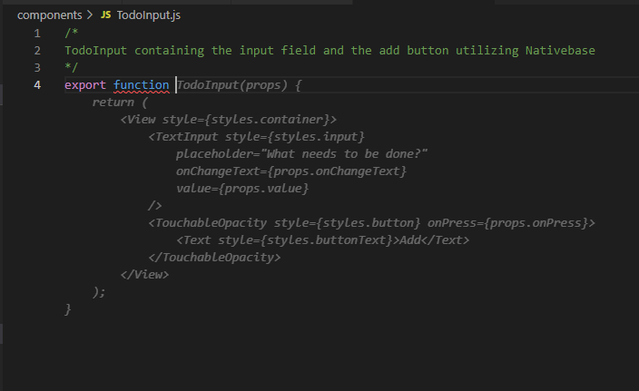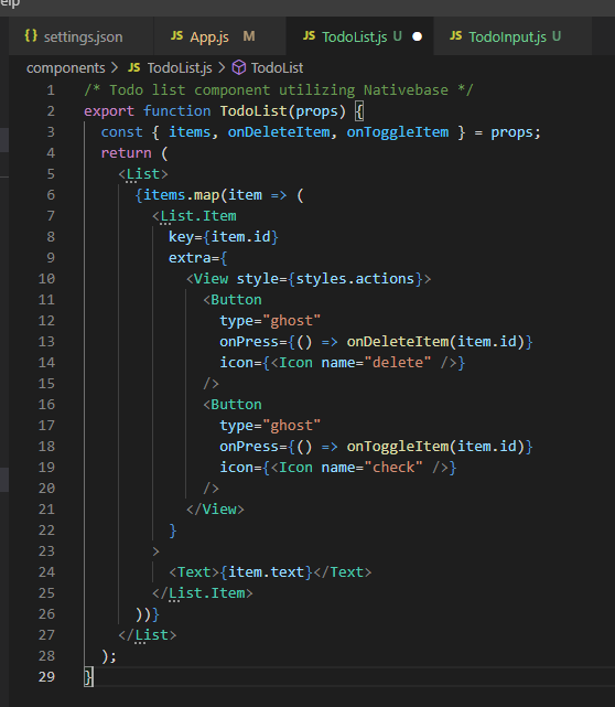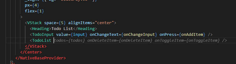 expo init my-app --template expo-template-native-baseAfter the application was created I removed the initial pieces I didn’t need and started utilizing GitHub Copilot. I started off by writing a comment under the App function that returns the React Components/functions so that there was context as to what I wanted and it worked surprisingly well. I wrote “Return the App containing and input field, and add button, and a todolist of items”. I then went down to where I wanted to start adding components and it started suggesting code. It suggested, utilizing NativeBase’s Heading component with Todo List as the heading.