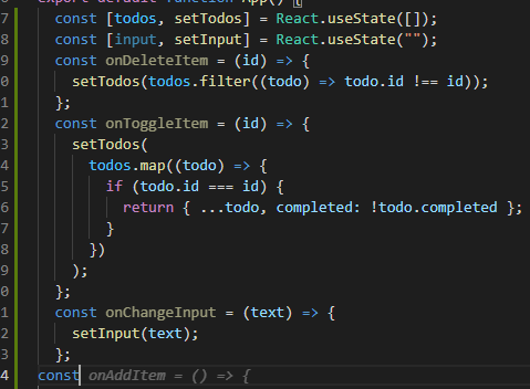 I had to make some modifications to make sure that everything worked and looked okay with NativeBase. After this, I went back to the main App component and underneath the App declaration started let GitHub Copilot start autocompleting and it provided me with state variables for the todo list and the input field. Then it started providing suggestions to write functions for deleting, adding, toggling, and the method to handle the input field change.
