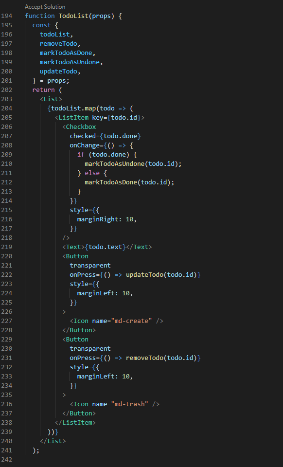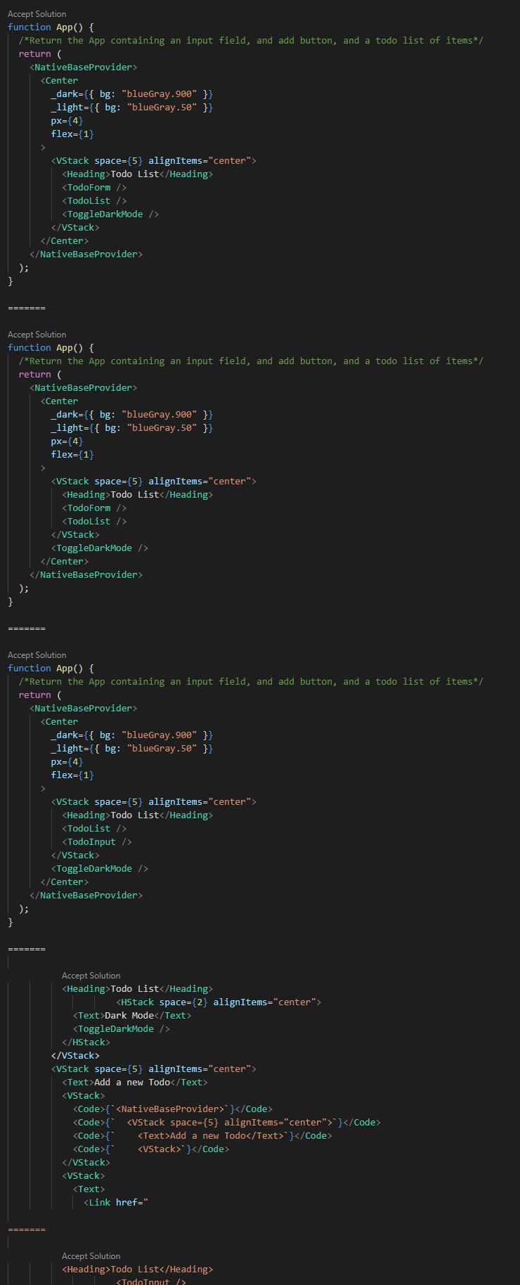 I then hit Ctr+Enter to suggest a much larger scope of solutions and it worked well again. It provided a variety of solutions, some using the vernacular TodoForm, or some using TodoInput as the input field component. There were some odd solutions as well that wrote the todo code as code as you can see in the 4th solution.