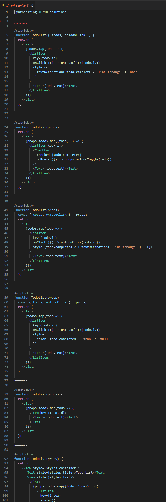 GitHub copilot is amazing. It works really well considering there aren’t many other solutions like it. In fact, the only other close competitor I’ve seen is called TabNine. That being said there are some limitations. The tool attempts to be context-sensitive and provide great solutions but it doesn’t really know that you are trying to build a project utilizing specific tools and trying to follow a specific design pattern. It will try to use its memory of billions of lines of code to try and provide a good solution but it may suggest different design patterns across your application that aren’t consistent. It may not always utilize the same variable/property/field names that you are using in your specific application( most of the time it does). It works better as something that forces you to think differently about your code and provides some initial boilerplate code but you have to build on it. It significantly reduces the time needed to build things. It wrote all of the code required to maintain the todolist state and my time was spent on the look/feel. This entire thing was built in 3 hours while I was multi-tasking. Is this going to replace developers? Not right now but given enough time, it has potential. Right now you need the development experience to determine what solution should be used but over time I could see more complex applications being handled by AI given a clear set of specifications.