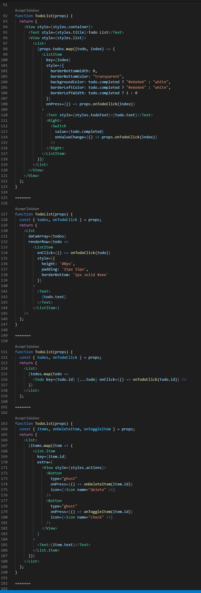 I then proceeded to do the same with the TodoList component and this time opted to see the different solutions it provided. As you can see below, the solutions it provided varied in complexity and again were cognizant of maintaining state and some solutions provided methods for deleting and toggle todo items.