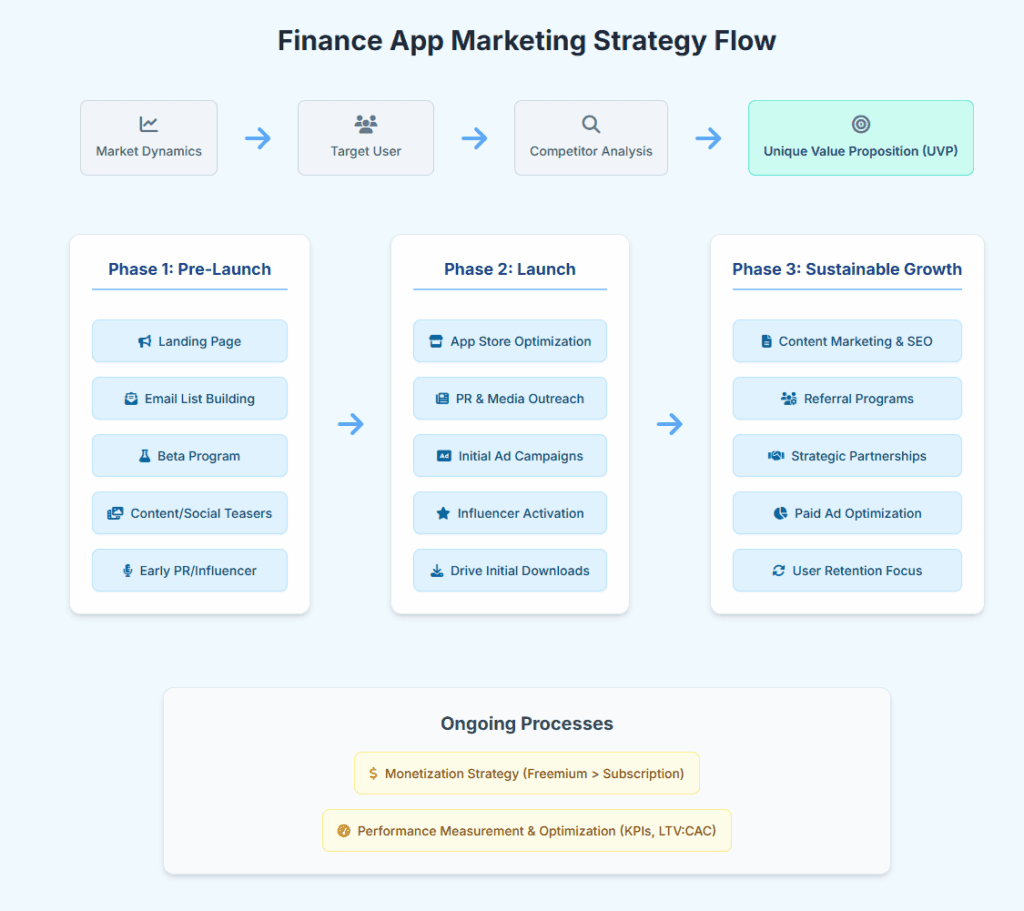 Launch: Executing a coordinated go-to-market push involving meticulous App Store Optimization (ASO), targeted PR and influencer collaborations (particularly with 'finfluencers'), and initial paid advertising campaigns across social media and search channels.