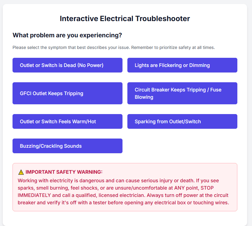 Convert this document into an html/css/js tool that can be used to troubleshoot or diagnose electrical issues.